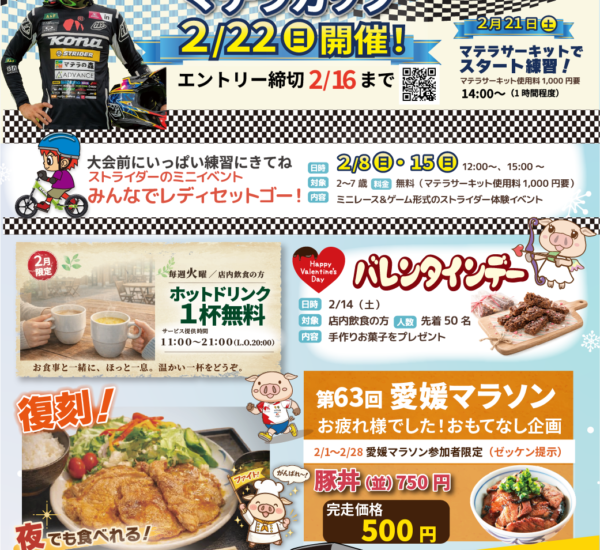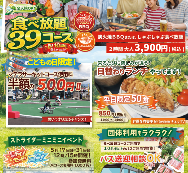 ストライダーご利用の注意点 マテラの森-管理 2021年3月16日 サーキットをご利用の際は、必ず受付にて誓約書にご記入いただきますようよろしくお願いいたします。(受付場所)平日:店舗内にある正面カウンター土日祝:サーキットエリア内にある銀色のバス レンタル品の返却につきましては、サーキットエリア内にある銀色のバスにスタッフが不在の場合は、店舗内にある正面カウンターへお持ちください。 サーキットエリア内にある観客席では、マテラの森のテイクアウト商品を召し上がることもできますので、どうぞご利用下さい。 ストライダー