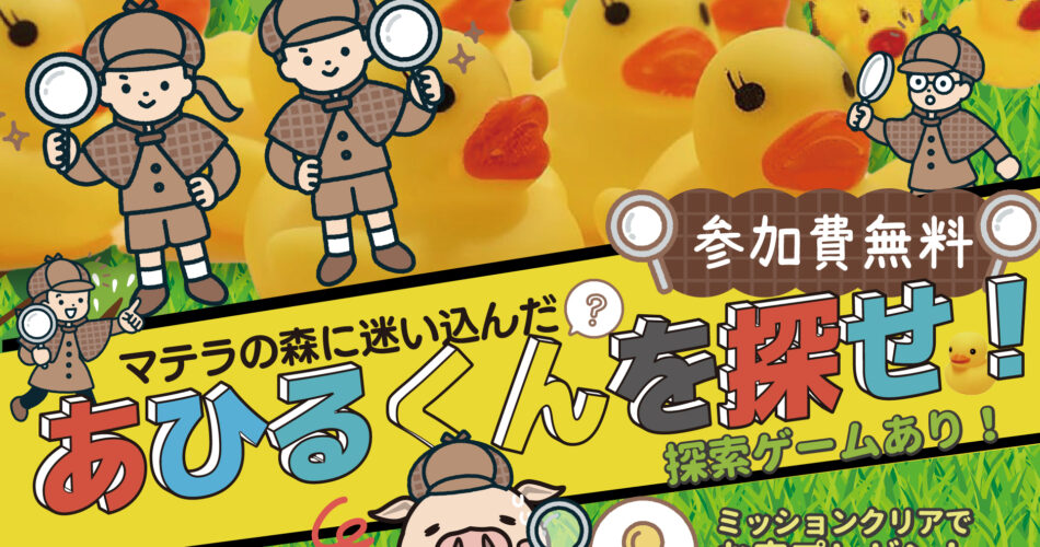 GW特別企画!あひるくんを探せ!ゲームします! マテラの森-スタッフ 2025年4月24日 熱中症対策として、水分持参をお願いします お子様は動きやすい服装でご参加くださいませ マテラの森の公園内に、ガチャガチャカプセルに入ったあひる人形が100匹隠れています。イベント後に、お好きなあひるくんを1匹お持ち帰りいただけます。お楽しみに♡ イベント情報