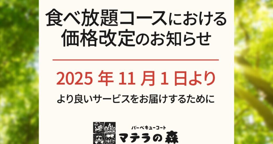 大きな変更点は各種食べ放題メニューで、その他のメニューにつきましてはおよそ1割程度の改定となります。何卒ご理解賜りますようお願い申し上げます。