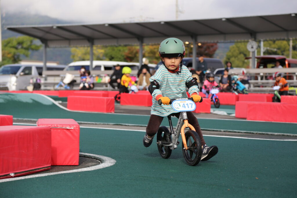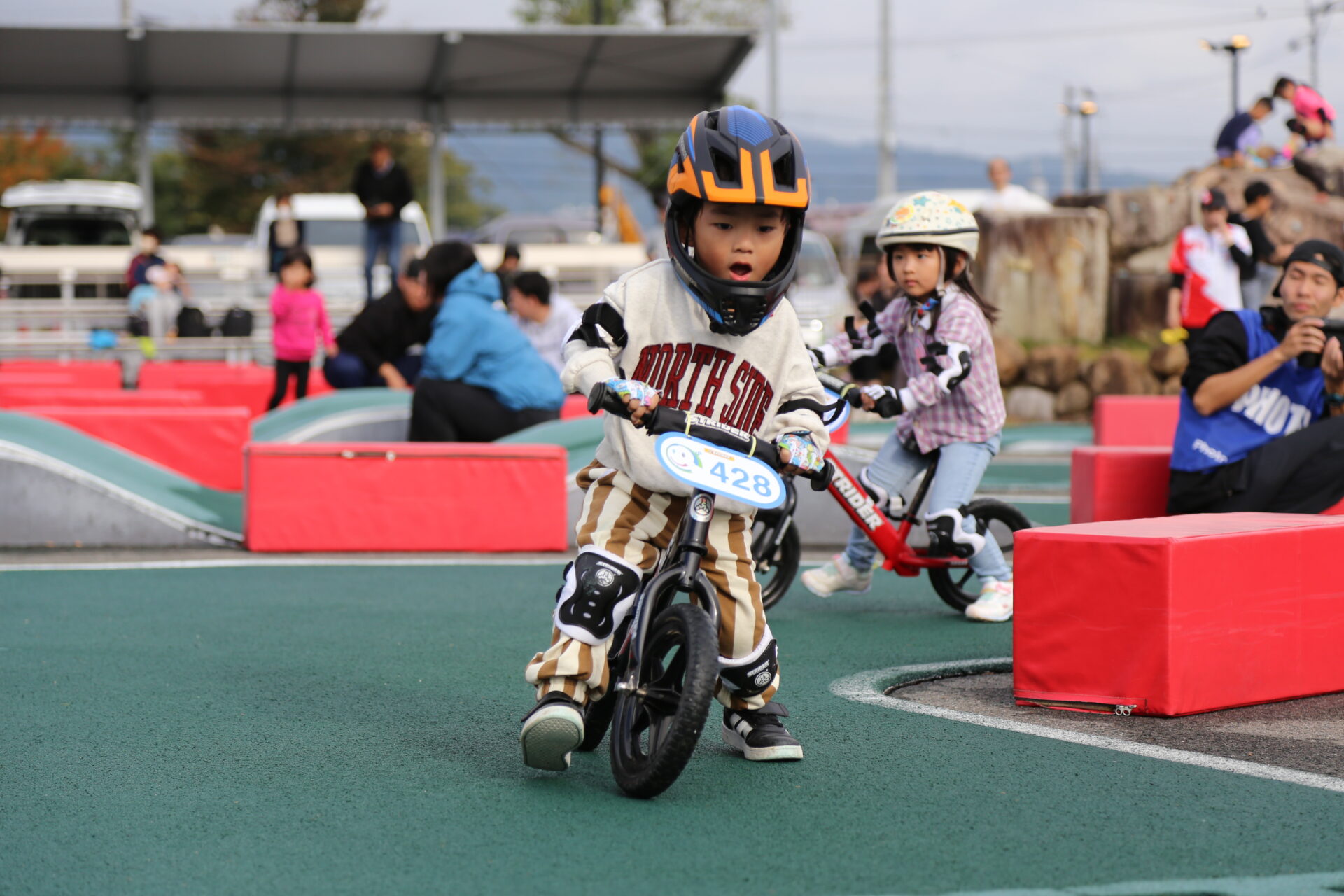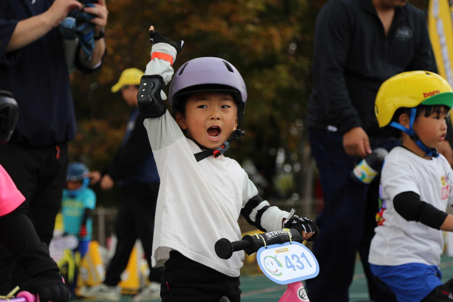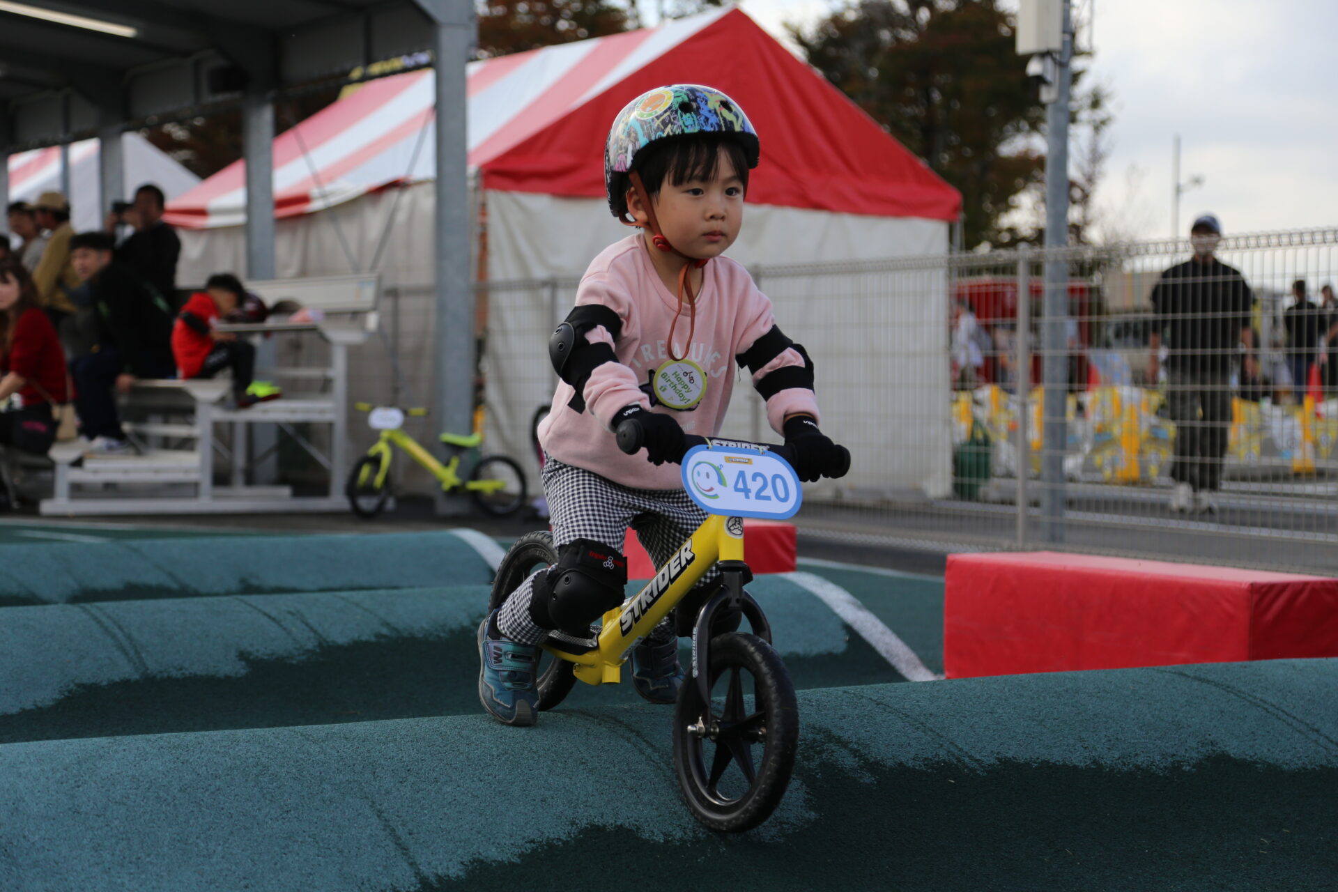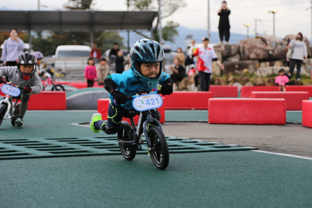 「レディ、セット、ゴー!」の合図とともに、小さな体で一生懸命にけり出す姿が印象的でした。フード越しの真剣なまなざしと、走り切ったあとの笑顔。初めての挑戦が、この日の主役でした。