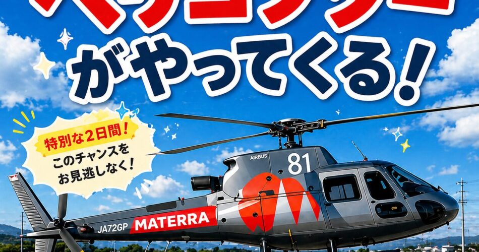 普段なかなか出会えない本格ヘリコプターを、マテラの森駐車場で見られます。