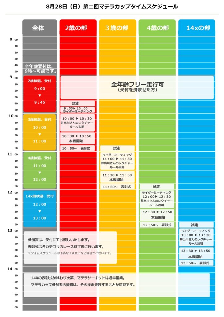 マテラカップタイムスケジュール マテラの森-スタッフ 2022年8月22日 インターネットでの事前エントリーは終了致しました。当日エントリーは可能ですので、参加クラスの受付時間にお越しくださいませ。 マテラカップ開催概要 マテラカップ開催まで、後一週間となりました。たくさんのちびっ子ライダーに会えるのを楽しみに待ってます! ストライダー