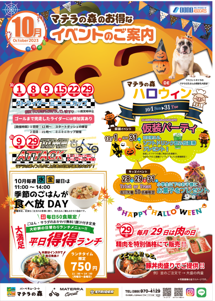 2023年10月イベントのご案内 マテラの森-スタッフ 2023年9月25日 マテラの森では、10月いっぱいハロウィン月間です。ハロウィンの仮装を写真を撮らせていただいた方には、ソフトドリンク無料券をプレゼントしちゃいます!ぜひ仮装して、遊びに来てくださいね♡ ミニミニカップでは、タイムアタックも実施いたします!各クラス上位者のタイムは、マテラの森インスタで配信いたしますので、ぜひ挑戦しに来てくださいね。 イベント情報