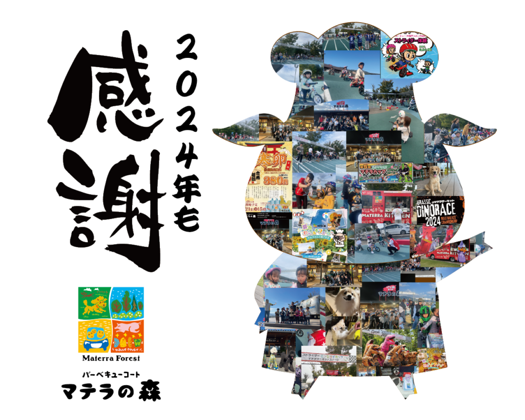 マテラの森からご挨拶 マテラの森-スタッフ 2024年12月28日 2024年もマテラの森をご利用いただきましてありがとうございました。縁が縁を呼ぶという言葉があるように、マテラの森でもご縁を感じるできごとが多々ありました。キッチンカー出店のご紹介、ドッグランでの出会い、マテラサーキット上で結んだ縁、皆様との縁の力に感謝です。来年はどんな縁があるか、今からわくわくしております。いいご縁と出会えるように、日々感謝しながら、サービスの向上を図ると共に誠心誠意努力する所存です。より一層のご愛顧を賜りますよう、スタッフ一同心よりお願い申し上げます。 SNS情報